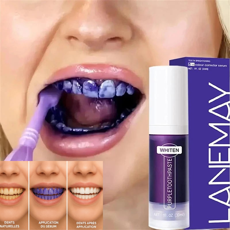 Utilise ton dentifrice habituel, puis applique 1–2 pompes du correcteur violet et brosse 1–2 minutes, rince. En usage quotidien ou en cure quand tes dents jaunissent plus vite (périodes de café/thé). Son format 30 ml est compact et pratique pour le sac ou le bureau : une habitude facile qui fait vraiment la différence sur ton sourire.