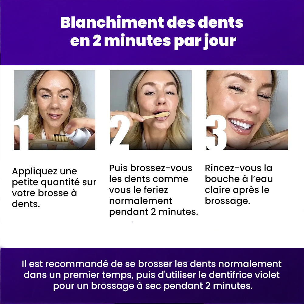 Brosse-toi d’abord les dents avec ton dentifrice habituel, puis rince ta brosse. Dépose 1 à 2 pompes du dentifrice violet, brosse 1 à 2 minutes, et rince soigneusement. C’est rapide et ça s’intègre facilement à la routine.