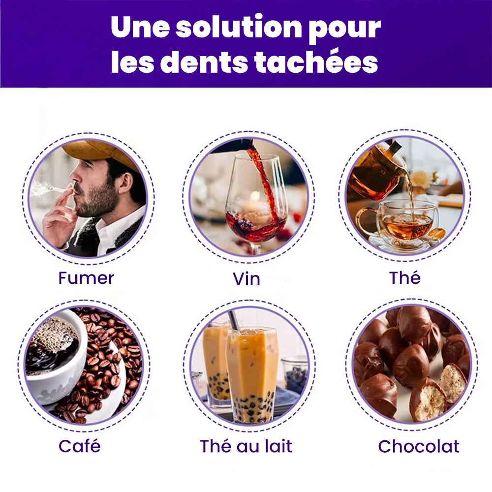 Il y a un effet immédiat grâce au violet qui neutralise les tons jaunes, et un effet progressif parce que la mousse aide à décoller les taches de surface (café, thé, vin, tabac). Les deux se complètent.